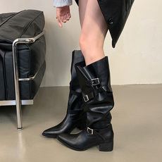 秋冬季长靴不过膝高筒靴高跟粗跟尖头裤管靴复古西部靴牛仔骑士靴