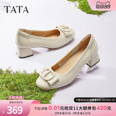 百丽班尼超软真皮法式单鞋女方头裸色高跟粗跟通勤工作皮鞋玛丽珍