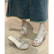 一字带粗跟水钻仙女凉鞋女时尚外穿2023新款拖鞋高跟鞋中跟配裙子