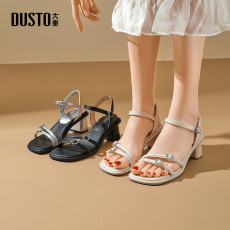 大东女凉鞋2025夏季新款粗跟高跟时尚舒适百搭圆头一字带女凉鞋女