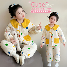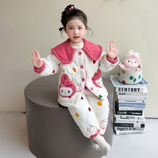 女童睡衣2025新款冬加厚珊瑚绒翻领套装宝保暖儿童三层夹棉家居服