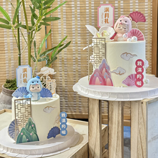 新中式粉蓝系蛇宝宝满月百天蛋糕装饰复古屏风山川插件翻糖小花朵