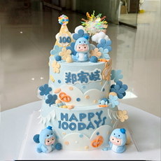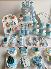 蓝色系虎宝宝周岁礼甜品台烘焙装饰宝宝百天翻糖扇子莲花竹子装扮