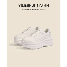 「鞋登」厚底小白鞋女单鞋浅口厚底真皮小个子圆头系带饼干鞋加绒