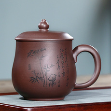 宜兴原矿套胆紫砂杯带内胆刻绘办公杯茶水分离三件套茶杯大容量男