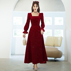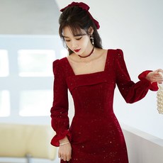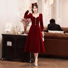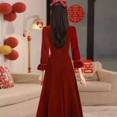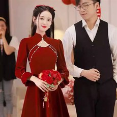 敬酒服新娘2025结婚新款冬季长袖丝绒红色礼服平时可穿订婚连衣裙