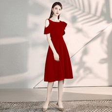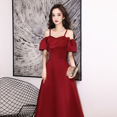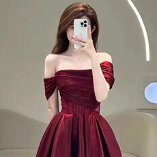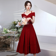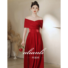 敬酒服新娘红色订婚连衣裙高级感缎面结婚当天便装一字肩晚礼服女