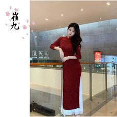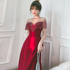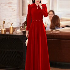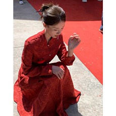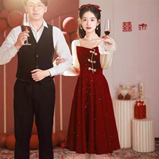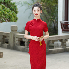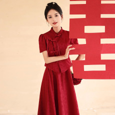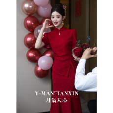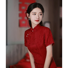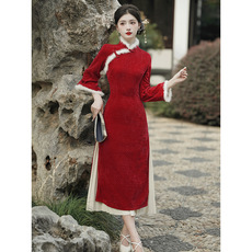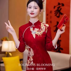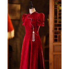 好质量中式国风雪尼尔红色改良旗袍连衣裙新年订婚结婚
