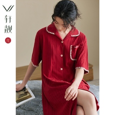 轩靓红色睡裙女夏季薄款纯棉短袖开衫睡衣本命年结婚家居服连衣裙