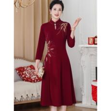 喜婆婆婚宴装结婚礼服2026新款妈妈装中年丝绒红色旗袍改良连衣裙