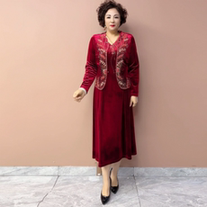 阔太太中年妈妈婚礼连衣裙两件套装金丝绒喜婆婆结婚红色礼服套装