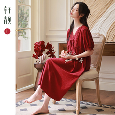 轩靓新中式睡裙女夏短袖长裙针织棉睡衣红色晨袍本命年结婚连衣裙