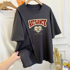 特大码300斤字母印花下摆开叉纯棉短袖T恤女夏季胖MM宽松显瘦上衣