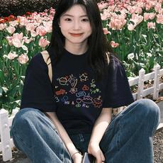 刺绣字母短袖T恤女2025夏装爆款百搭刺绣上衣纯棉显瘦链条体恤女