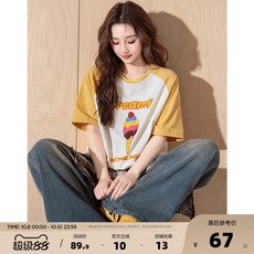 唐狮2025夏季女新款短袖T恤黄色插肩袖字母印花上衣纯棉撞色休闲