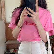 夏季多巴胺玫粉色短袖t恤女微胖正肩显瘦小众字母树莓粉上衣纯棉