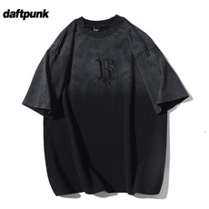 270g重磅纯棉字母刺绣渐变短袖t恤潮牌嘻哈宽松水洗做旧上衣男女