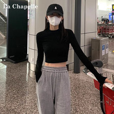 拉夏贝尔撞色纯棉长袖打底衫女秋冬新款欧货修身内搭T恤短款上衣
