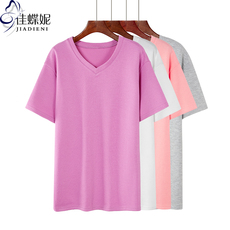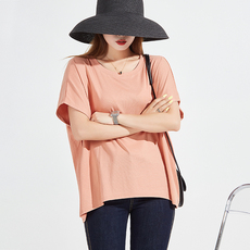 春夏女装韩版宽松大码时尚妈妈纯棉中长款开叉V领短袖T恤纯色上衣