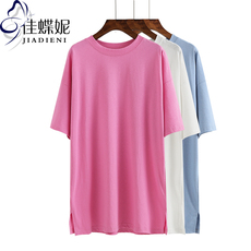 夏季新款圆领宽松大码半袖休闲纯白纯色中长袖马卡龙色短袖T恤女