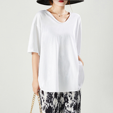 夏季新款韩版纯白V领宽松休闲短袖T恤女装中长款纯色简约上衣内搭