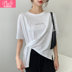 中长款开叉短袖T恤女夏韩版宽松圆领白色纯白体恤打底衫纯色休闲