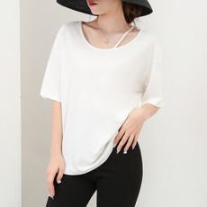 夏季新款莫代尔棉宽松T恤女中长款圆领露肩休闲短袖纯色简约上衣