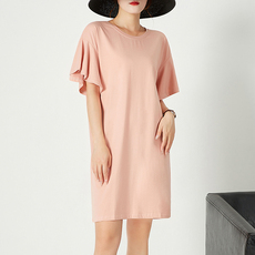 宽松圆领喇叭袖连衣裙女夏韩版纯棉女装中长款纯色网红短袖T恤裙
