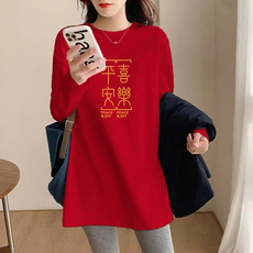 欧货酒红色打底衫女2025春季中长款宽松纯色U型下摆内搭长袖t恤