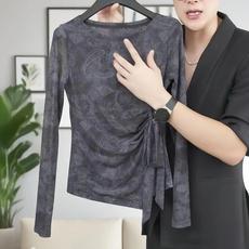 eihey诶嘿2026秋冬新品复古抽褶绑带修身显瘦印花长袖T恤女配围脖