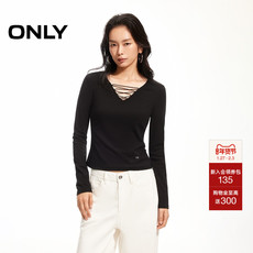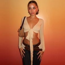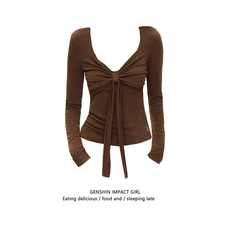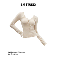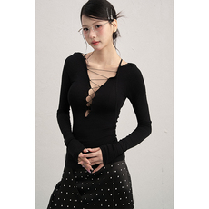 YoungGirlDay纯欲风性感V领胸前绑带镂空修身显瘦长袖打底T恤上衣
