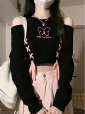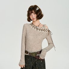 eihey诶嘿蝴蝶结绑带扭结设计感斜肩纯欲风修身辣妹露肩长袖T恤女
