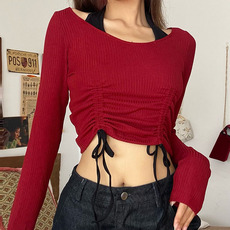 YoungGirlDay纯欲辣妹性感紧身显瘦交叉绑带收腰长袖打底T恤上衣