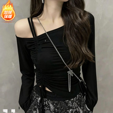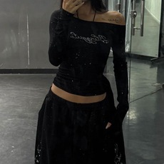 美式辣妹烫钻斜肩长袖T恤女爵士jazz纯欲风绑带修身显瘦露肩上衣