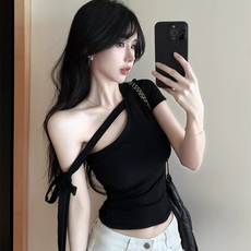 pusumede独特漂亮蝴蝶结绑带露肩别致t恤女夏季修身法式斜肩上衣