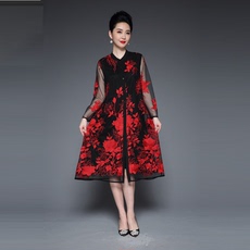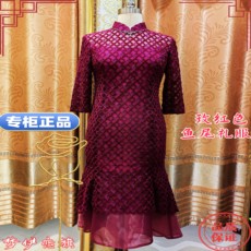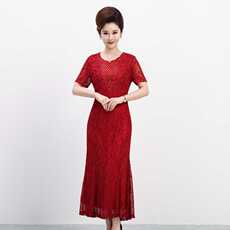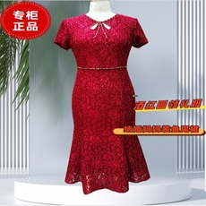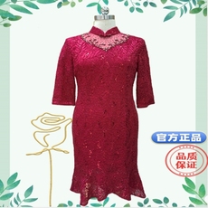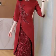 新款鱼尾旗袍春夏装蕾丝中长款连衣裙妈妈装结婚红色国风礼服裙