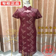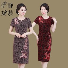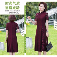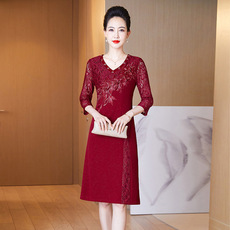 2025新款旗袍裙春夏装半袖蕾丝中长款连衣裙妈妈装结婚红色礼服