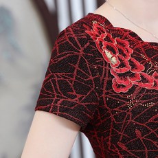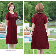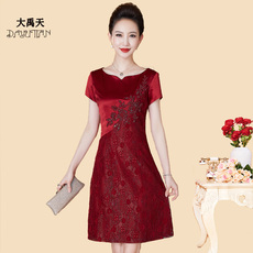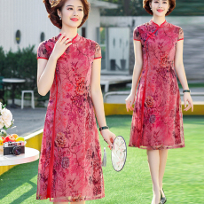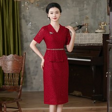 2025春夏装短袖蕾丝新款旗袍裙中长款连衣裙妈妈装结婚红色礼服