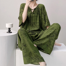 睡衣女春夏季绵绸新款家居服可外穿国风女士短袖空调房棉绸套装薄