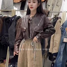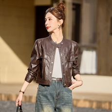 2024女士真皮短款皮衣绵羊皮荔枝纹小方领宽松休闲夹克外套潮流范