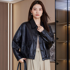 2025秋冬海宁女式绵羊真皮皮衣短款修身棒球服皮夹克简约休闲外套