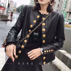 2018海宁秋冬新款真皮皮衣女短款绵羊皮修身铆钉皮夹克外套