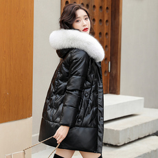 海宁真皮衣女士中长款连帽韩版宽松大码女装外套冬季绵羊皮羽绒服