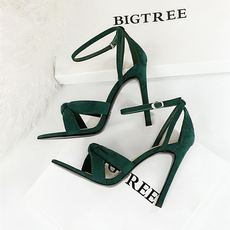 高跟凉鞋女2023年新款绒面绿色一字带扣高跟鞋女细跟性感气质名媛