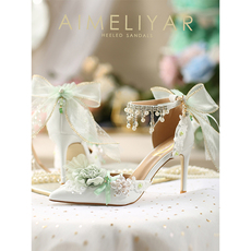 森系仙女风薄荷绿色花朵蝴蝶结珍珠水钻洛丽塔公主尖头细高跟女鞋
