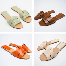 拖鞋女新款夏季简约舒适中跟软底一字拖绿色大码妈妈真皮凉拖外穿