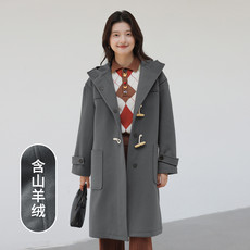 20464现货羊绒连帽牛角扣大衣女中长款冬季加厚斗篷式羊毛呢外套