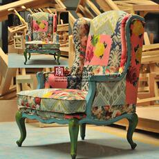 法式田园彩色拼布老虎椅 北欧实木休闲沙发 美式乡村沙发椅