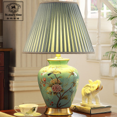 圣玛美式“湖蓝色花鸟”台灯卧室书房客厅全铜陶瓷台灯古典床头灯