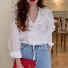 春秋新款纯棉文艺纯色拼接花边翻领衬衫长袖宽松百搭显瘦衬衣女士